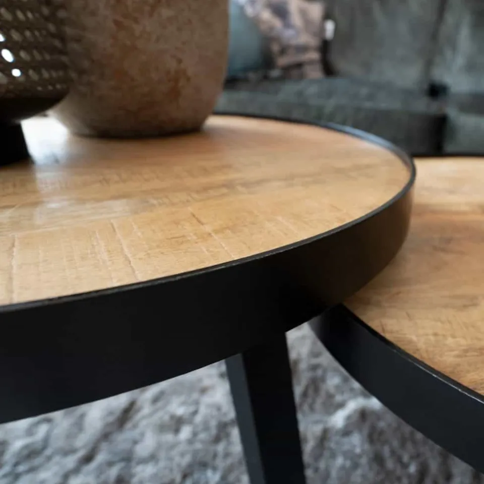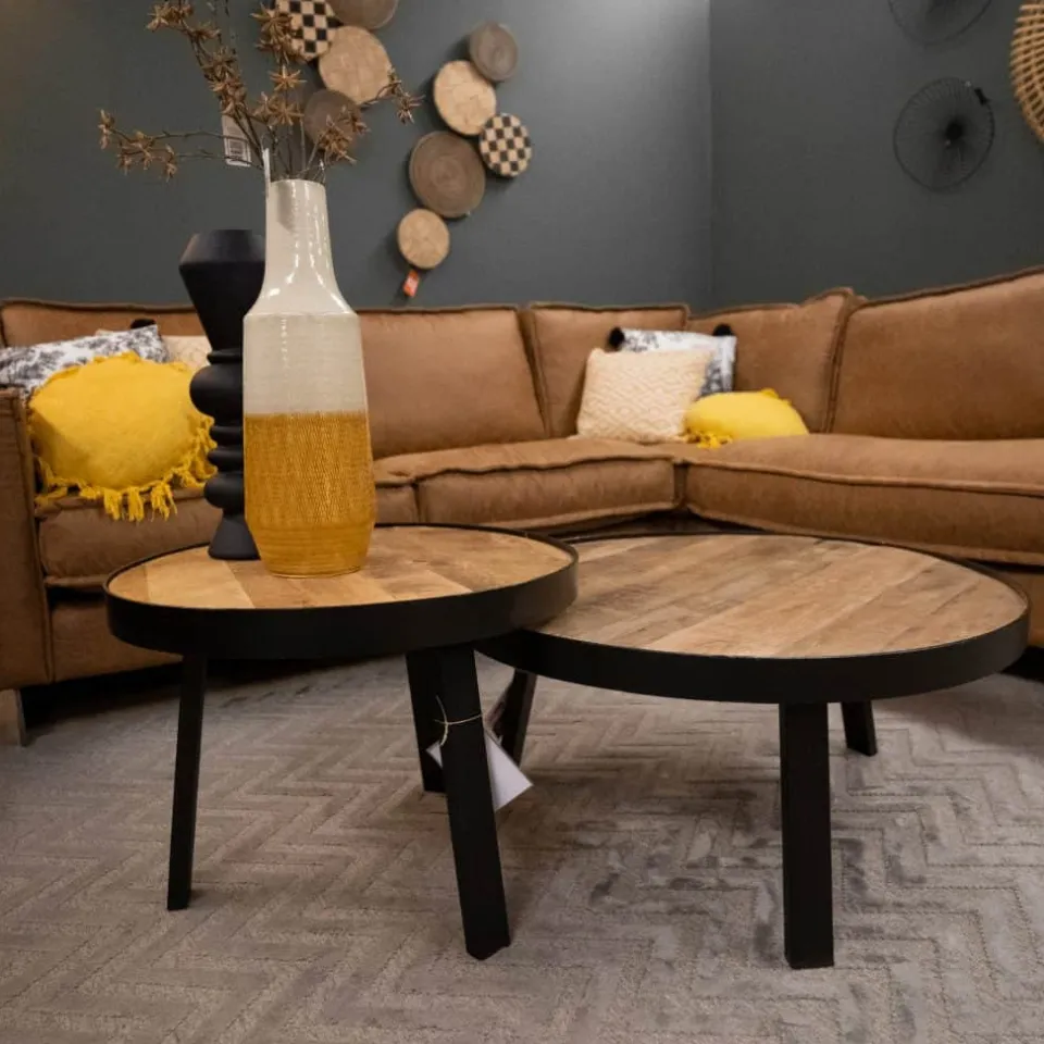 Salontafelset Sanne van mangohout en metaal HUUS collectie combineert natuurlijke charme met industrieel design in één veelzijdige set. Deze set bestaat uit twee ronde tafels met massieve mangohouten bladen en een zwart metalen rand en poten — een stijlvolle match die zowel warmte als stoerheid uitstraalt.Dankzij het ingenieuze ontwerp kun je ze speels onder elkaar schuiven: gebruik ze als één set voor de bank of split de grote en kleine tafel als salontafel en bijzettafel
