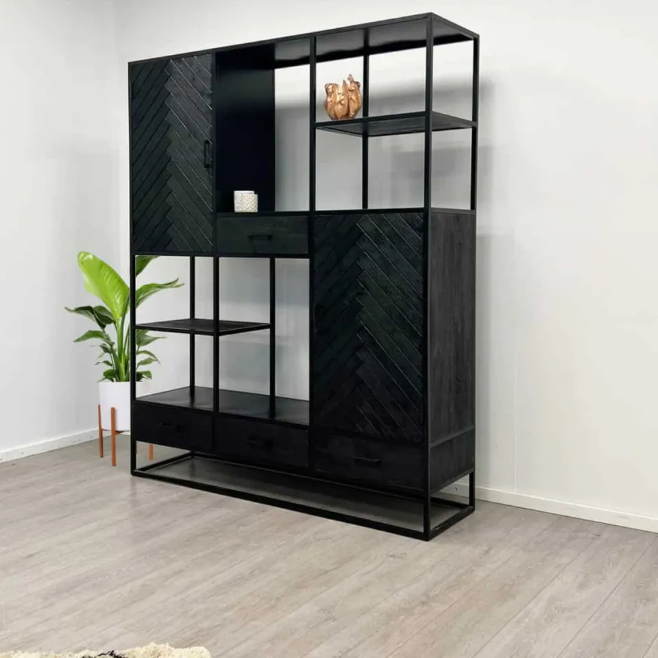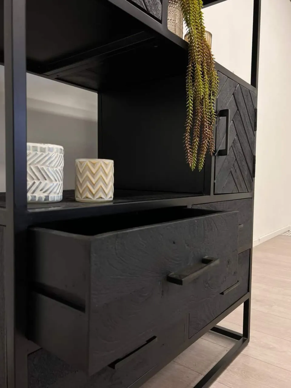 Wandkast Floor is een elegante blikvanger die luxe en karakter toevoegt aan je interieur. Gemaakt van zwart mangohout en afgewerkt met een verfijnd visgraatmotief straalt deze kast klasse en warmte uit. Dankzij de combinatie van deuren en lades biedt Floor volop opbergruimte voor al je spullen, terwijl het design moeiteloos past in moderne en industriële woonstijlen. Verkrijgbaar in twee formaten, zodat je de kast perfect kunt afstemmen op jouw ruimte.