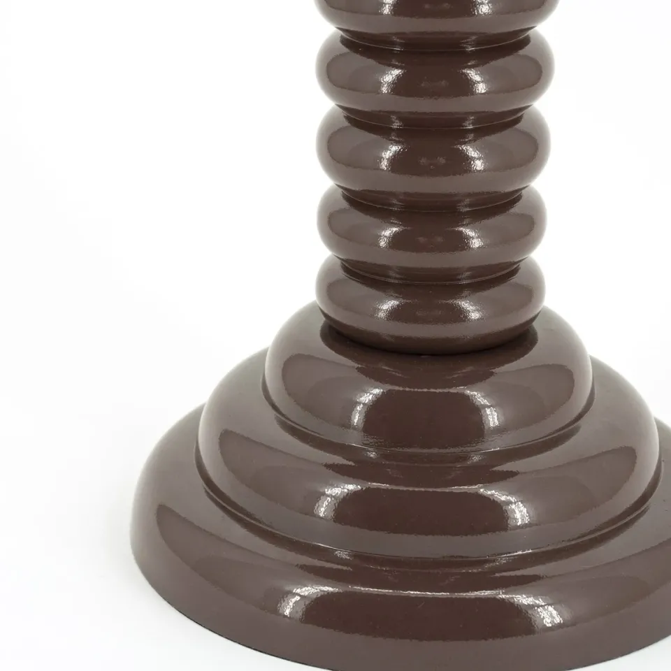 Ontdek bijzettafel Basco, een prachtig en speels meubelstuk dat direct de aandacht trekt in elke ruimte. Gemaakt van hoogwaardig, gecoat aluminium in een stijlvolle donkerbruine kleur, biedt deze bijzettafel een chique en verfijnde uitstraling. De unieke ronde vormen van de tafelpoot geven bijzettafel Basco een bijzonder en modern karakter, terwijl het speelse ontwerp zorgt voor een levendige en dynamische toevoeging aan je interieur. Perfect voor het plaatsen van decoratieve items, een kopje koffie, of een boek naast je favoriete fauteuil.