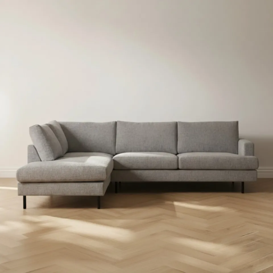De hoekopstelling maakt het eenvoudig om een duidelijke en gezellige zithoek te creëren. In combinatie met het slanke onderstel blijft de ruimte overzichtelijk en ruimtelijk, ook in een wat kleinere woonkamer. Zo is deze hoekbank zowel praktisch als stijlvol in gebruik.