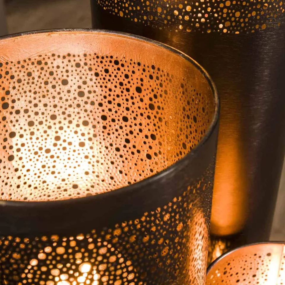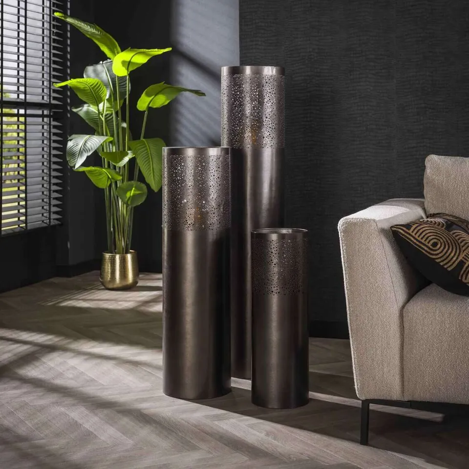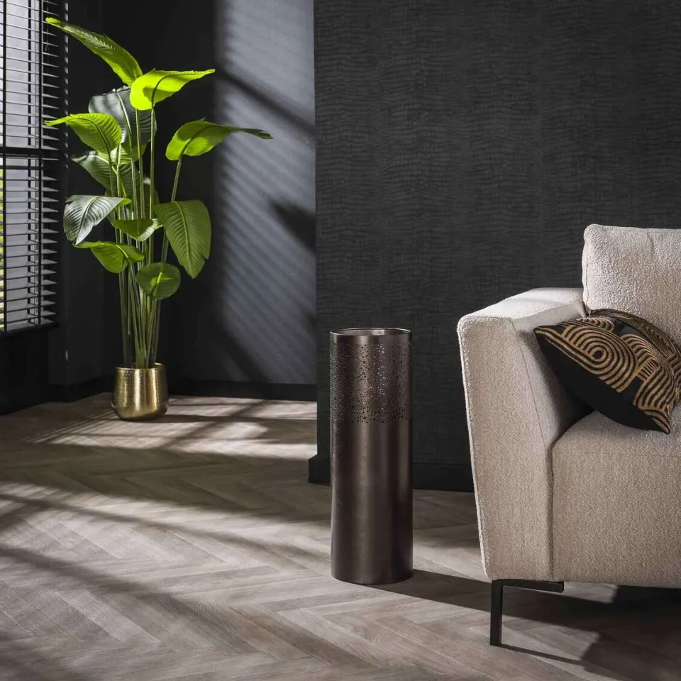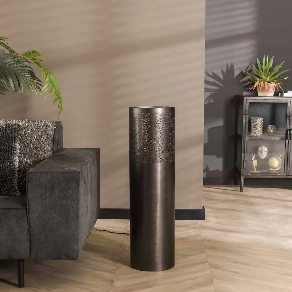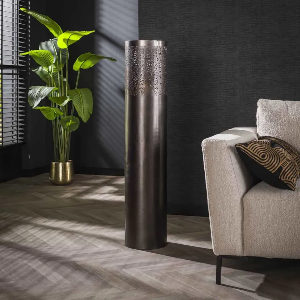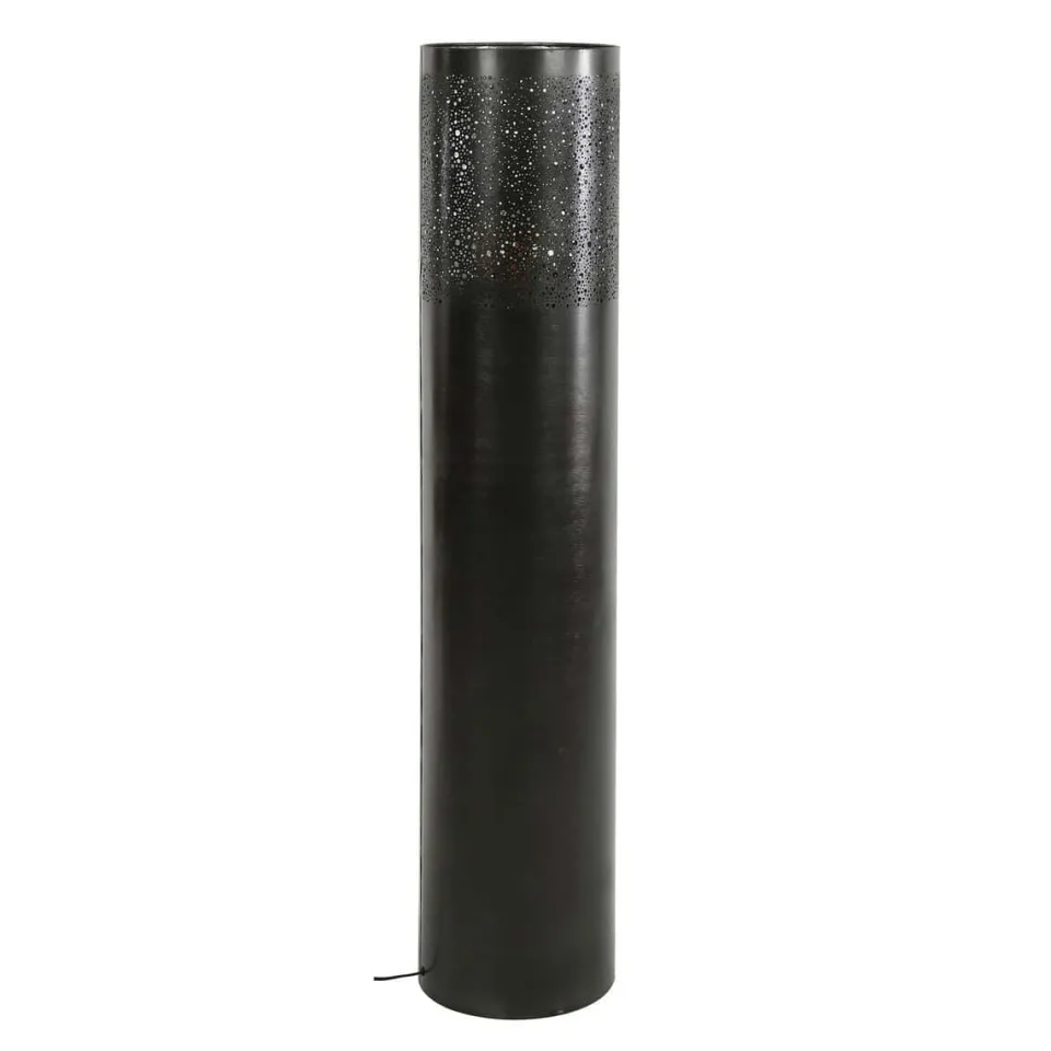 Deze vloerlamp Dolcis heeft een cilindervorm. De lamp is uitgevoerd in metaal met zwart nikkel afwerking. Aan de bovenzijde is het model voorzien van diverse ronde gaatjes in verschillende groottes, waardoor het licht op een speelse manier er doorheen schijnt.