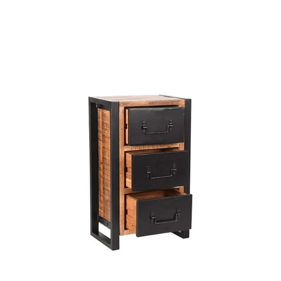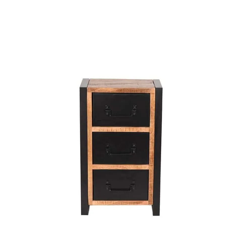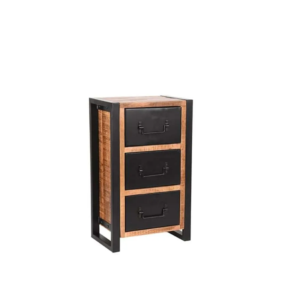 Ladekast Brussels, uitgevoerd in de kleur rough is gemaakt van ruw, duurzaam mangohout en heeft een bijzondere, individuele uitstraling door de unieke draad van het hout. Ladekast Brussels heeft aan beide zijden een robuust metalen frame waar 3 laden tussen liggen waar je al je kleine spullen in op kunt bergen.