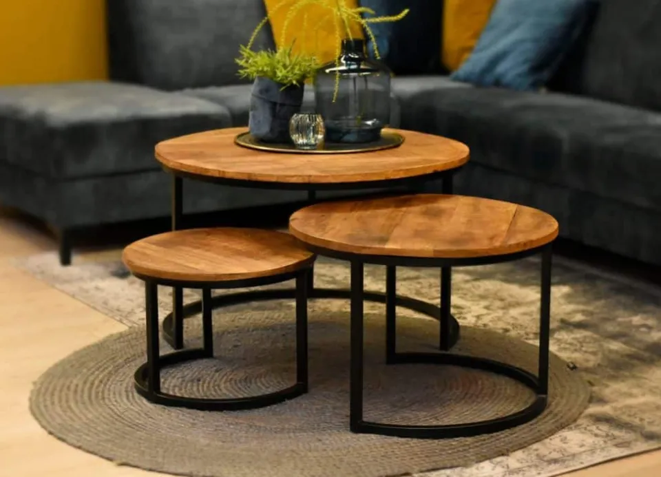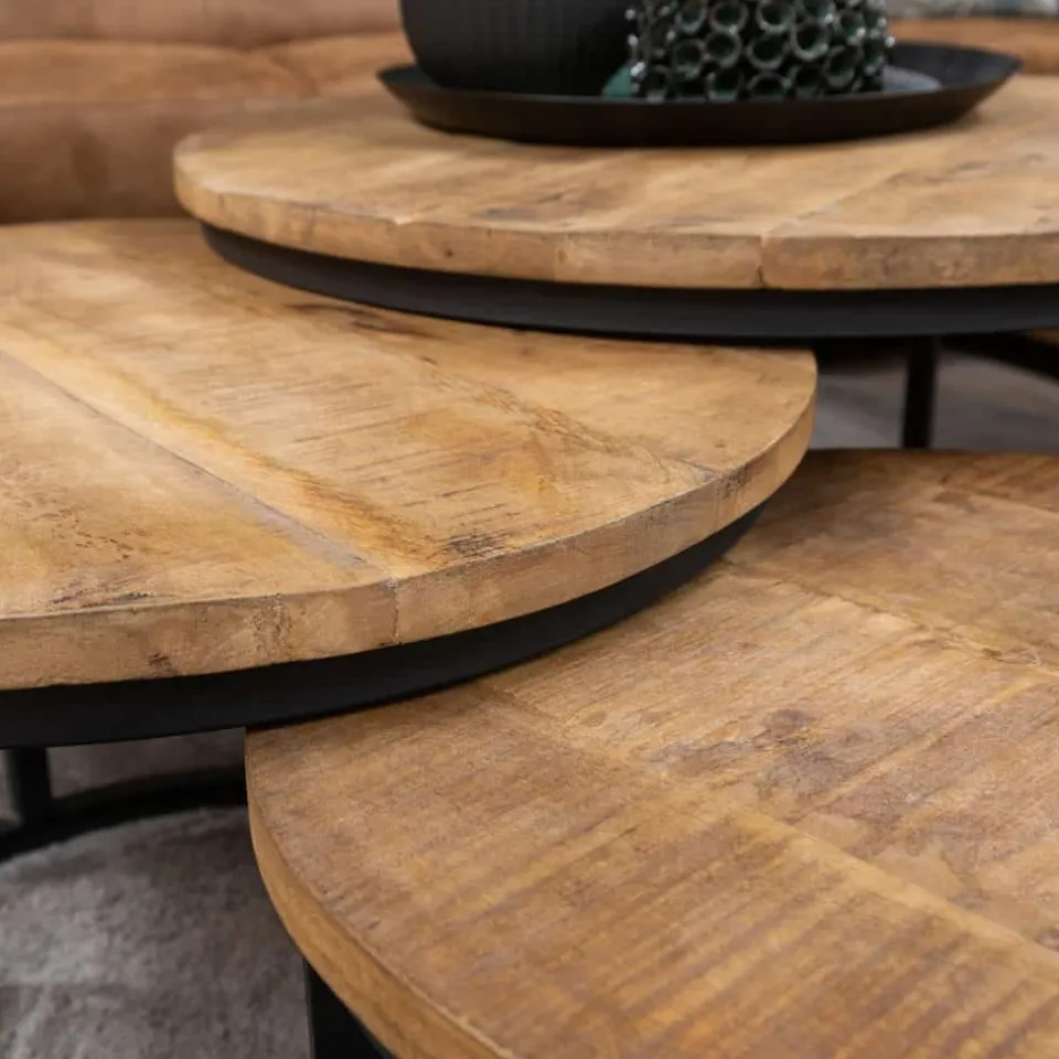 Salontafelset Kim uit de HUUS collectie in mangohout en metaal is de perfecte mix van warmte en stoer industrieel design. De set bestaat uit drie ronde tafels die samen een speels geheel vormen, maar ook afzonderlijk te gebruiken zijn. Het mangohouten blad straalt natuurlijke charme uit, terwijl het metalen frame zorgt voor stevigheid en een stoere uitstraling. Zo past deze set moeiteloos in een modern, industrieel of eigentijds interieur.