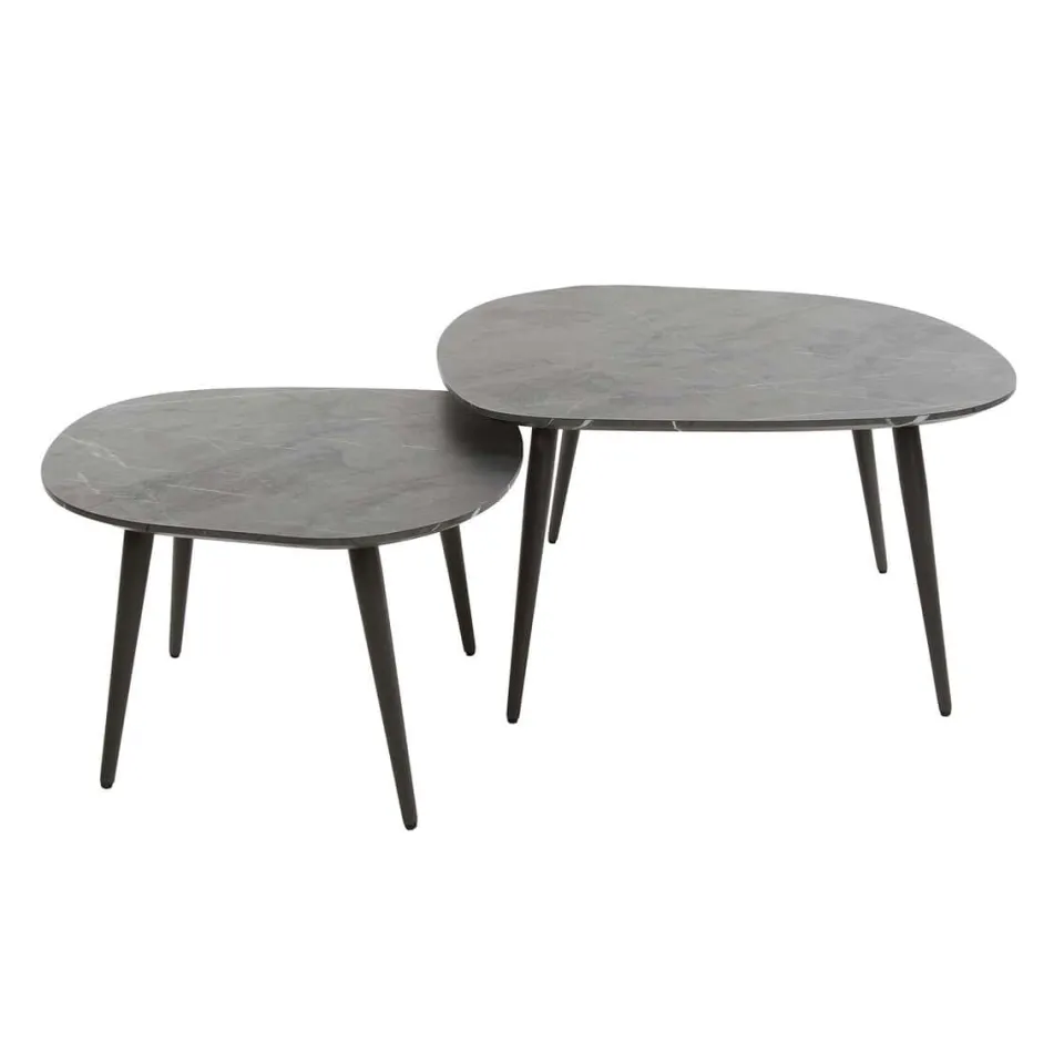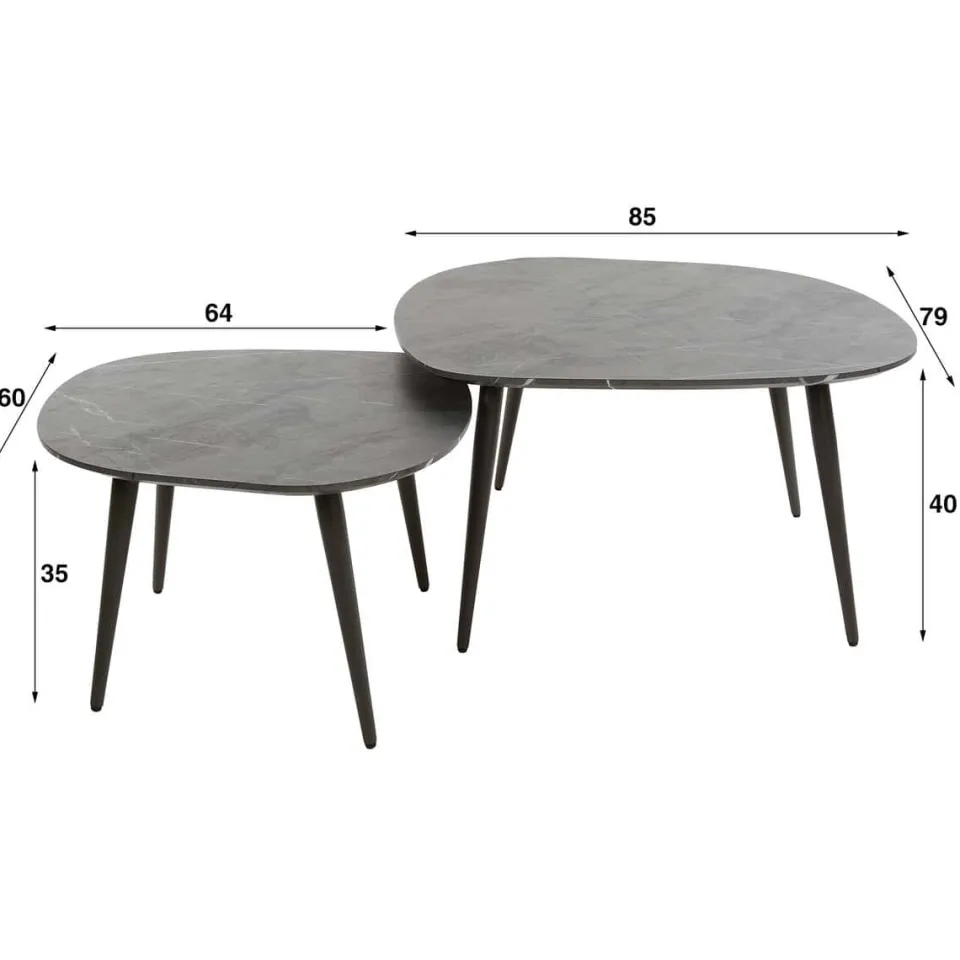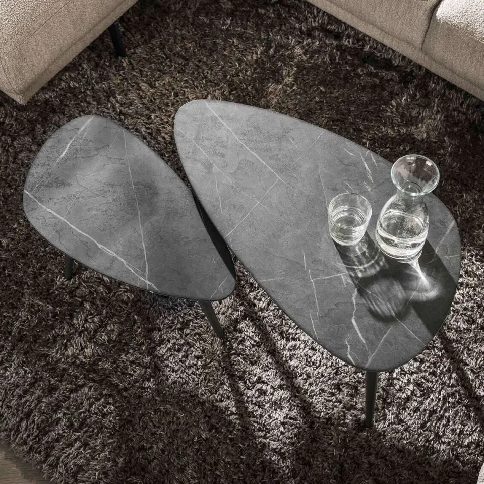 Deze salontafel set van 2 is uitgevoerd in melamine met een keramiek uitstraling en frame in staal. De tafel is haast niet te onderscheiden van een keramiek tafel. Het handgemaakte tafelblad is voorzien van een laagje melaminehars dat is aangebracht op hout. Het materiaal wordt door hitte en druk aangebracht. Het prachtige materiaal in combinatie met de peervorm, geeft een trendy, maar tegelijk ook tijdloze tafel.