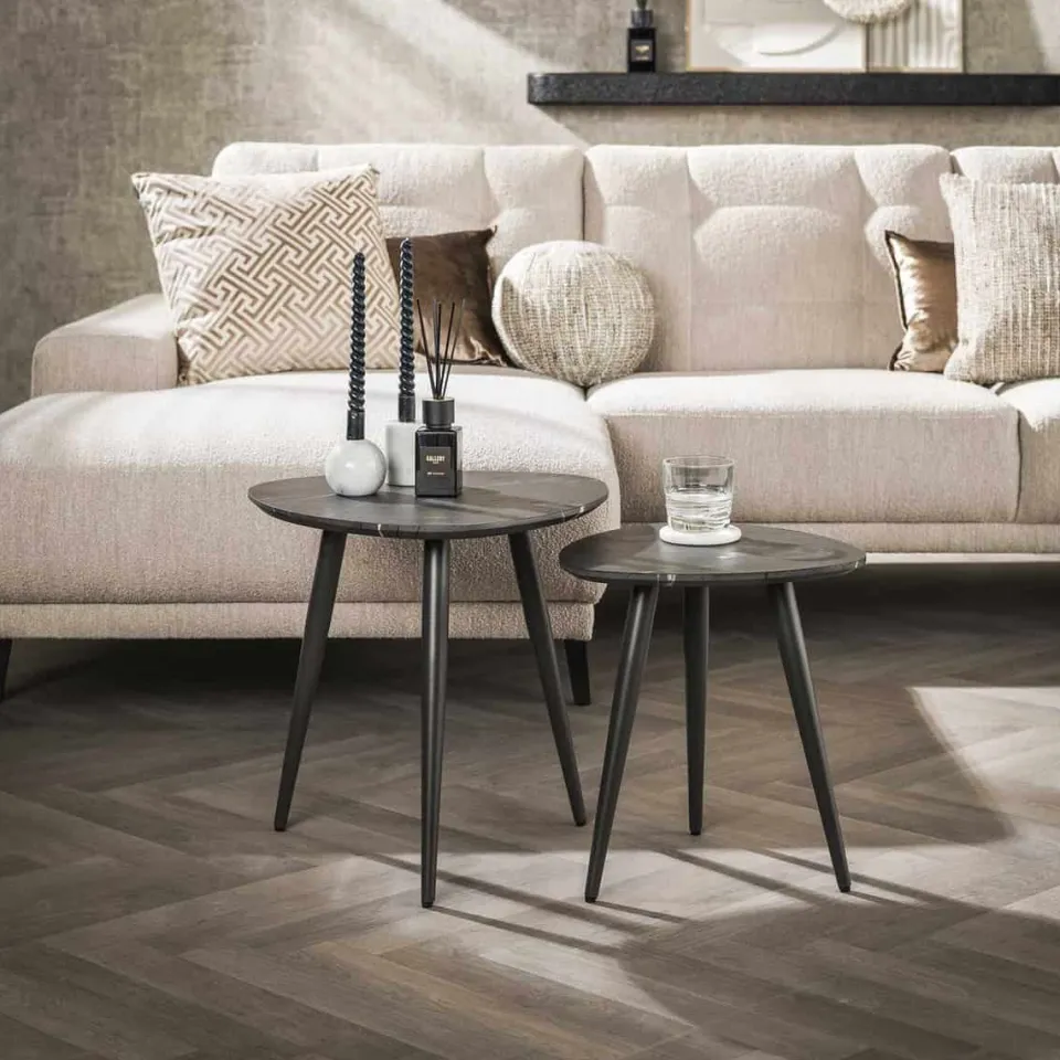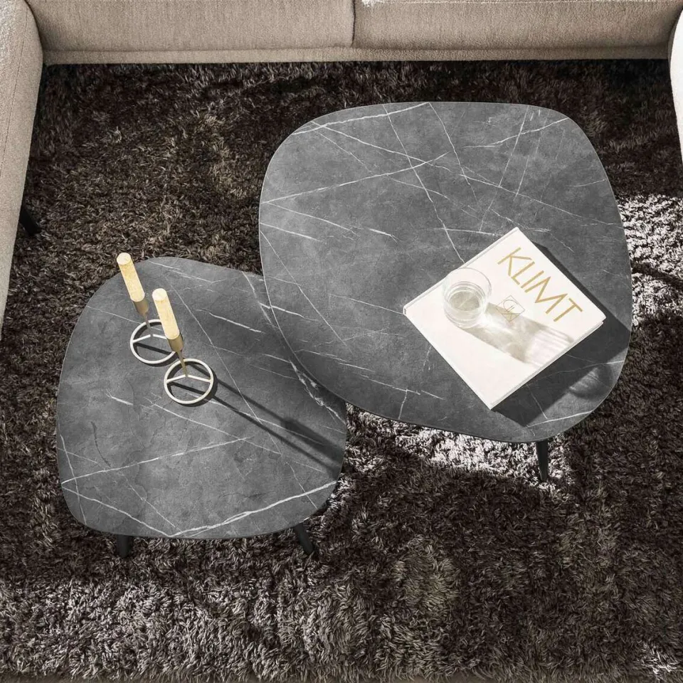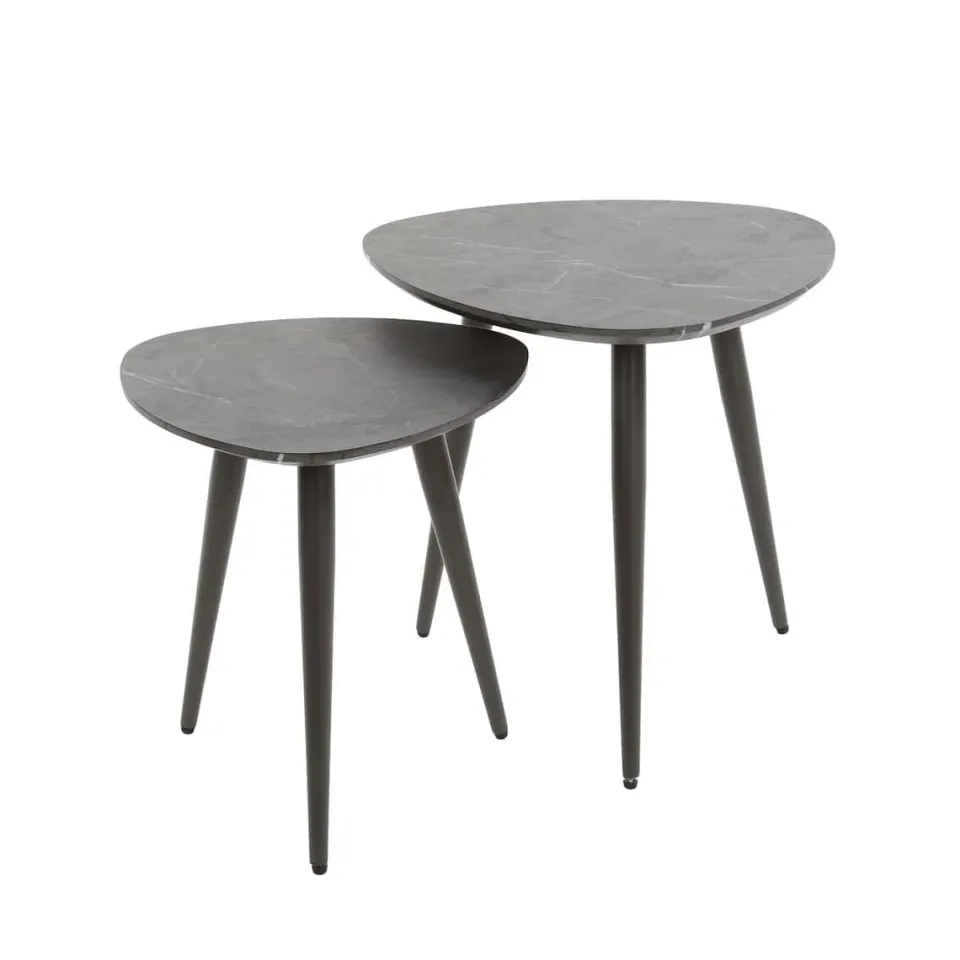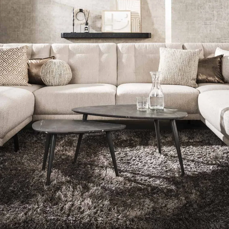 Deze salontafel set van 2 is uitgevoerd in melamine met een keramiek uitstraling en frame in staal. De tafel is haast niet te onderscheiden van een keramiek tafel. Het handgemaakte tafelblad is voorzien van een laagje melaminehars dat is aangebracht op hout. Het materiaal wordt door hitte en druk aangebracht. Het prachtige materiaal in combinatie met de peervorm, geeft een trendy, maar tegelijk ook tijdloze tafel.