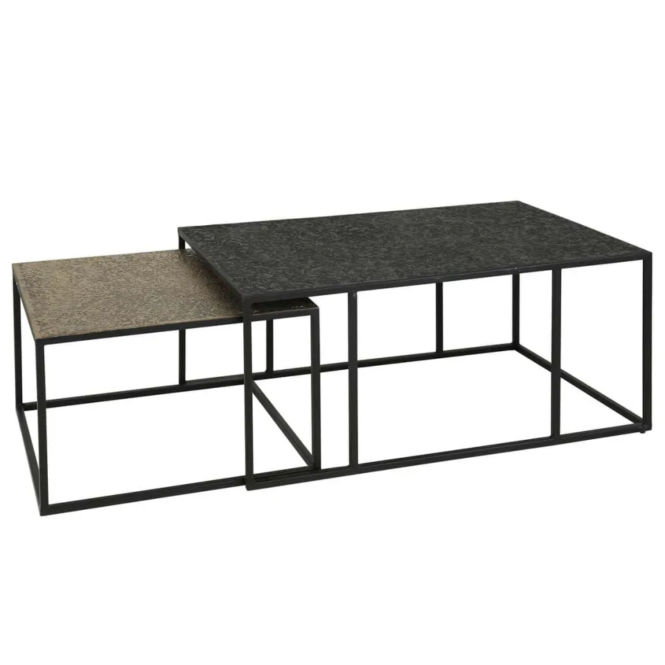 Deze trendy salontafel set van 2 is uitgevoerd in ‘metallic’ antiek brons en zwart. Op het blad zit een hele mooie bewerking welke een unieke uitstraling geeft. De tafels kunnen naar eigen inzicht speels bij elkaar neergezet worden. Deze set is een echte eye-catcher en maakt deel uit van de ‘metallic’ serie.