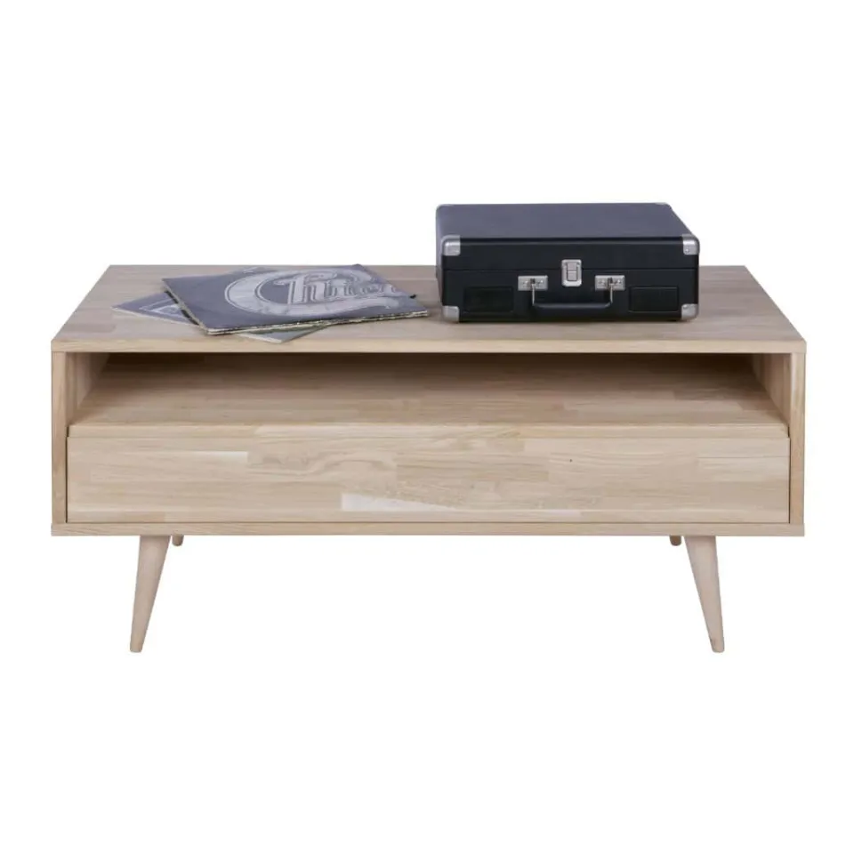 Tv-meubel Tygo van onbehandeld eiken is een basic. Deze retrostijl brengt een speciale eigentijdse jaren zestig sfeer in huis. Dit wandmeubel is uitgevoerd met 1 lade en 1 open vak waar voldoende ruimte is om media apparatuur, DVD’s en CD’s op te bergen. En daarom is dit meubel voorzien van een gat in het onderblad (achter de lade) zodat de bedrading daar doorheen gelegd kan worden.