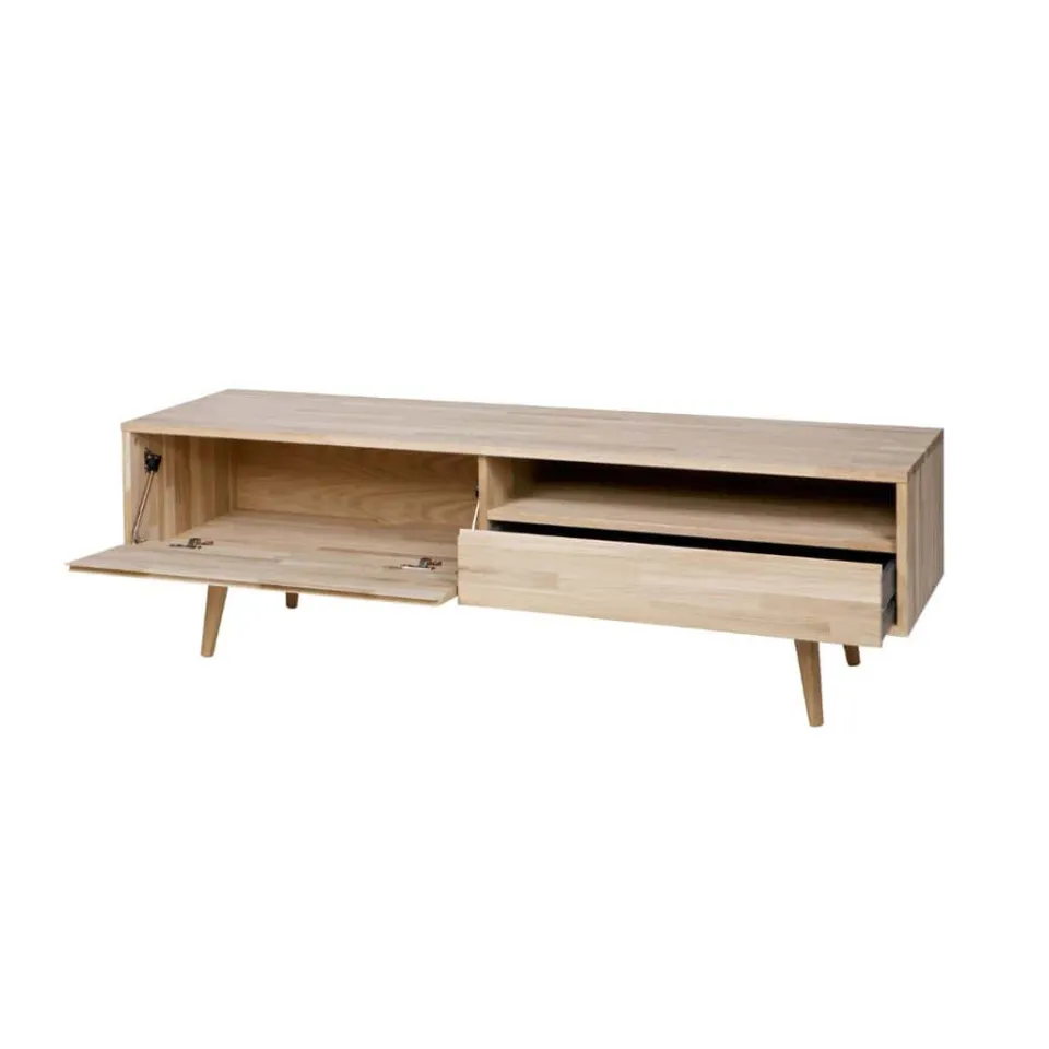 Een TV-audiomeubel dat heel veelzijdig is. De afmetingen van dit meubel zijn (bxhxd): 100x47x43 cm. Het onbehandeld eiken bestaat uit stroken verlijmd eikenhout. Ter bescherming van het meubel wordt geadviseerd het eiken te behandelen met meubelolie of lak. Het TV-audiomeubel is ook verkrijgbaar in de breedte 150 cm.